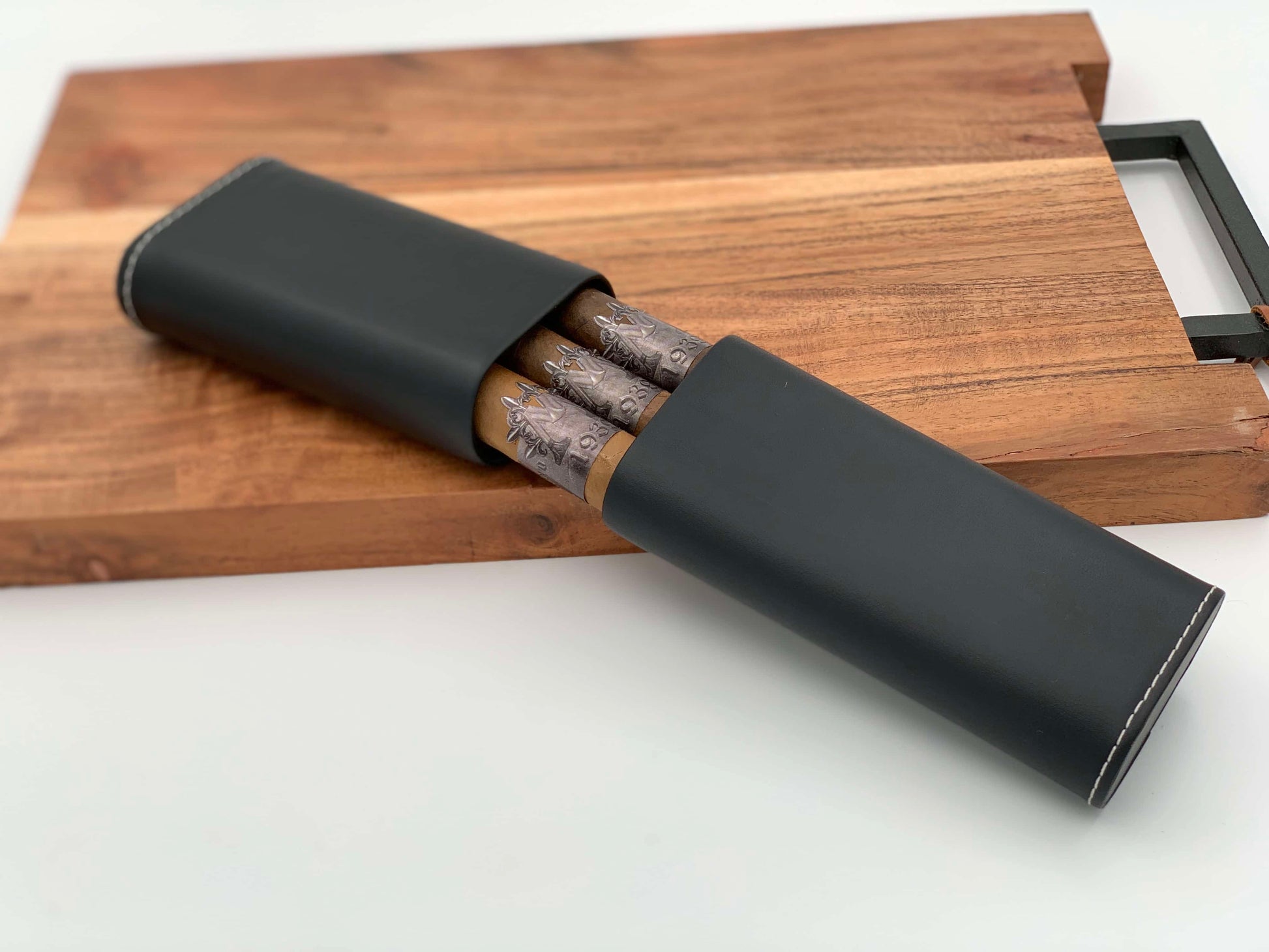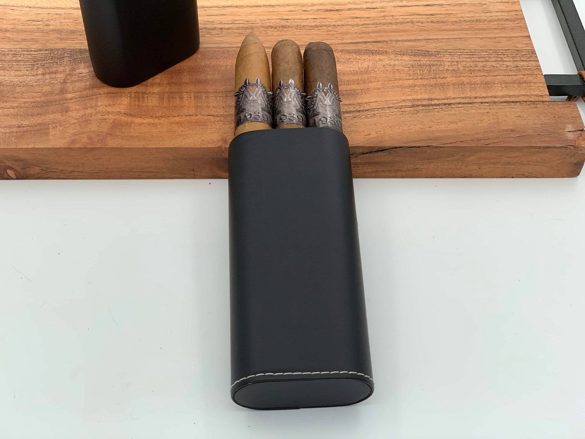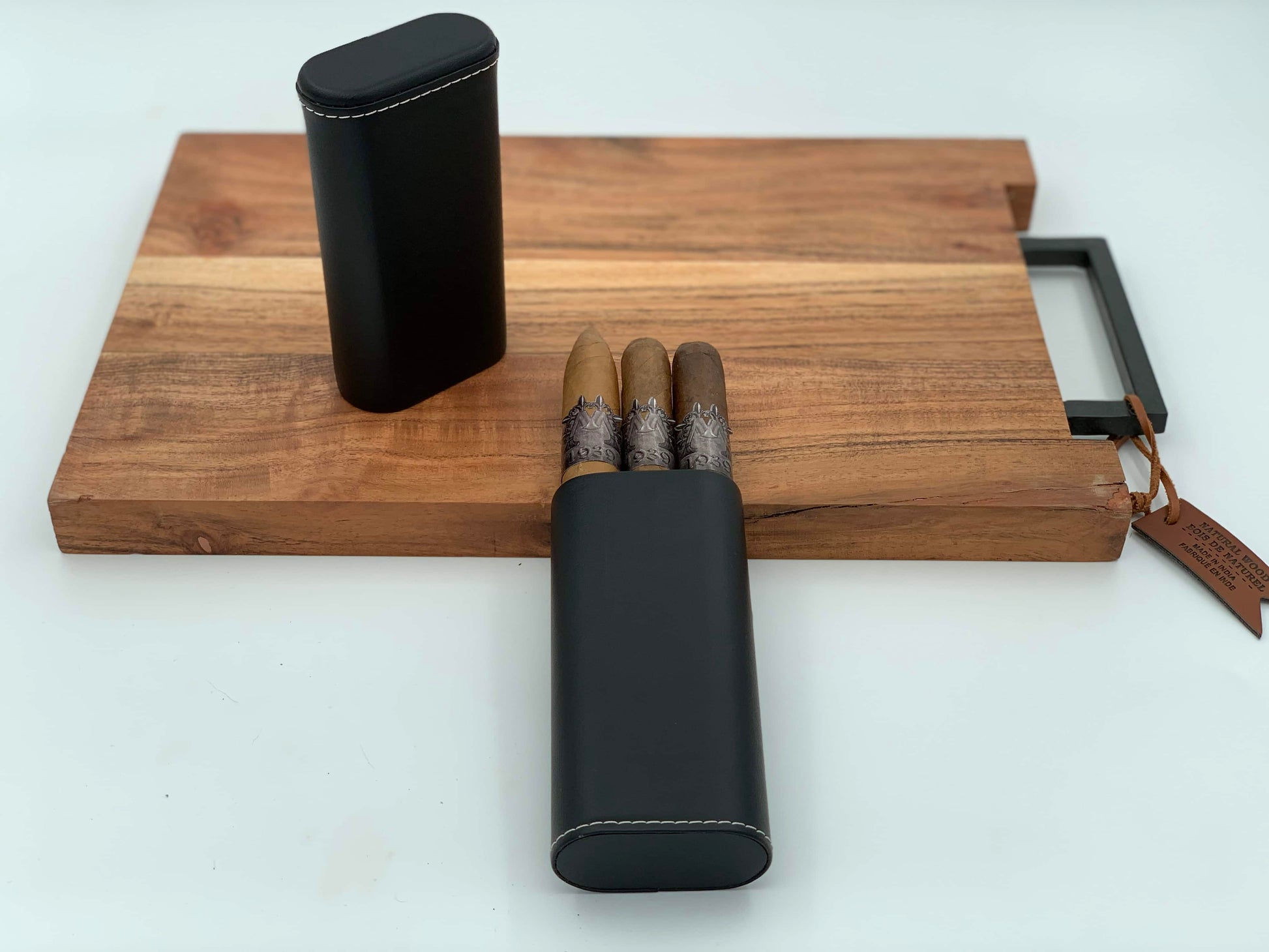 Comes with the 3 cigars (varied) of the month and a beautiful Black Leather Cigar Case.